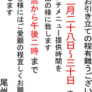 年末 開店~14時まで(28日~30日まで)31日はお持ち帰りの営業